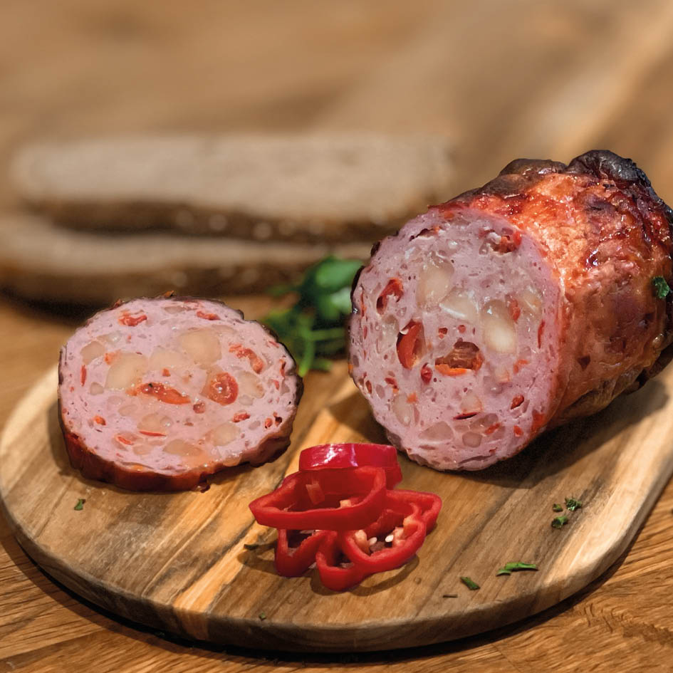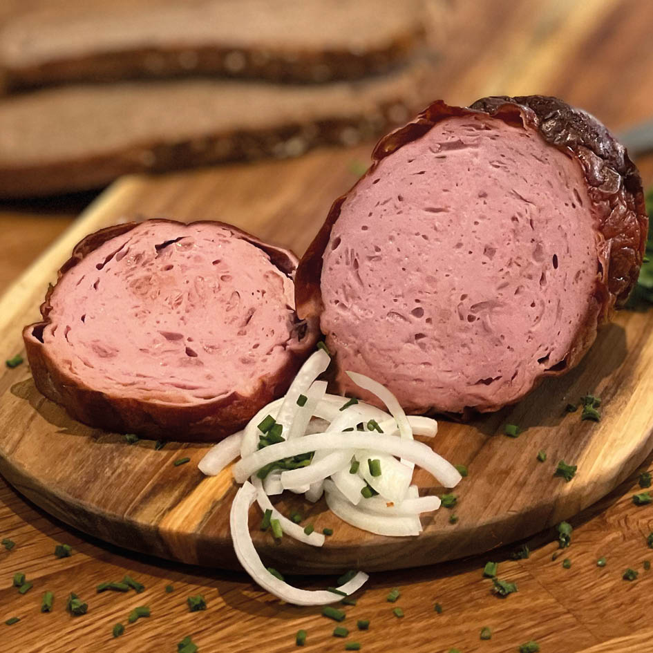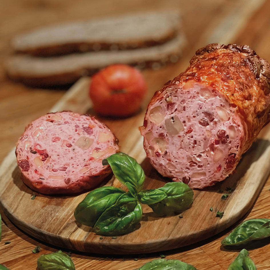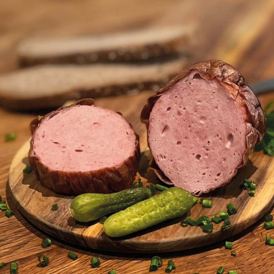 Herzhaft und aromatisch. Mit feinen Zwiebelstücken, die dem Leberkäs eine würzig-süße Note geben. Für alle, die's gern deftig mögen. Perfekt zu: Bratkartoffeln, Spiegelei, frischem Bier
